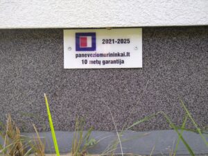 Tvora iš fibo blokelių armuota ir dengta dekoratyviniu tinku. „Mozaika” ant cokolio Panevėžyje.